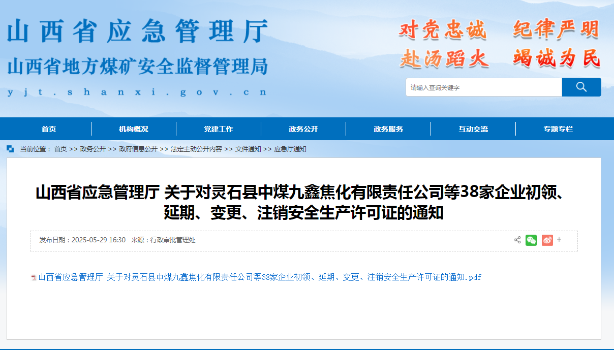 山西省應(yīng)急管理廳 關(guān)于對靈石縣中煤九鑫焦化有限責任公司等38家企業(yè)初領(lǐng)、延期、變更、注銷安全生產(chǎn)許可證的通知
